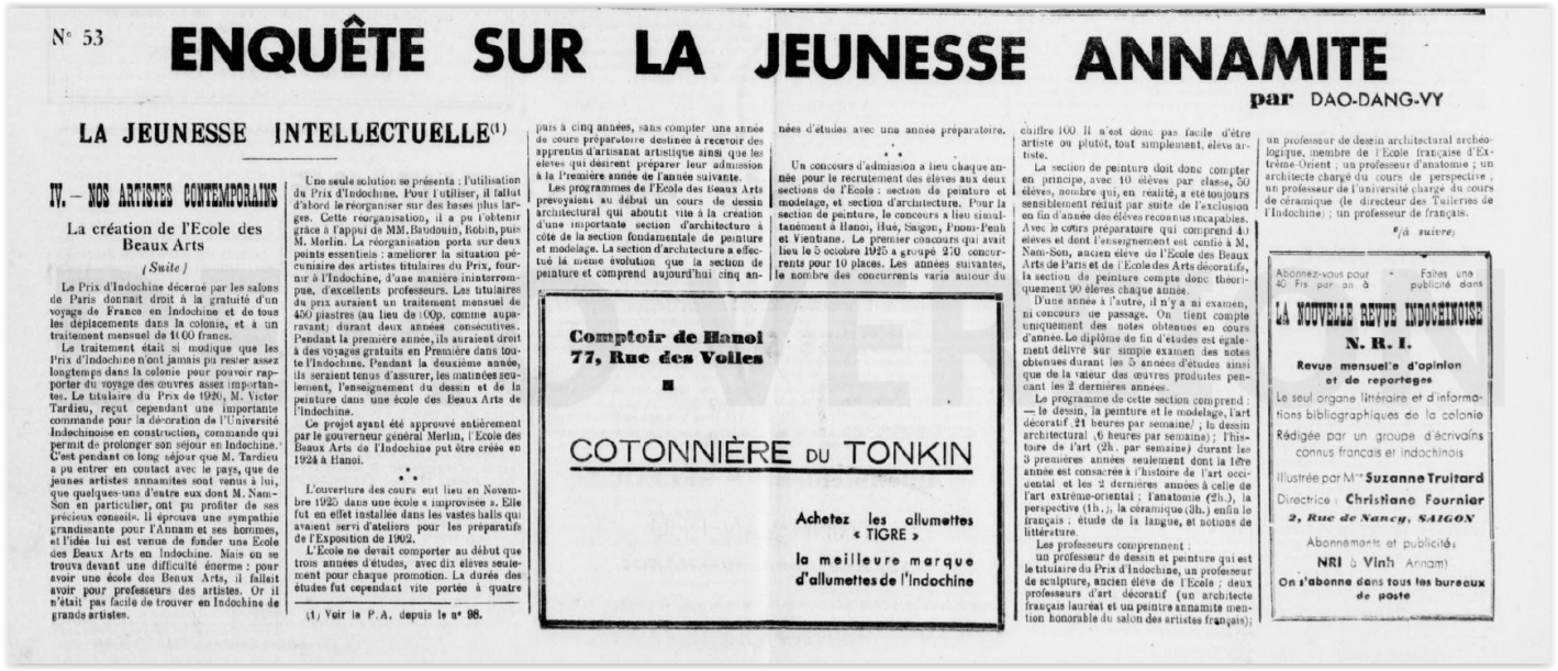 En 1936, au mois d’août, sont publiés quatre articles avec le témoignage de M. NGUYEN Lam Son concernant la création de l’Ecole des Beaux-Arts de l’Indochine. (23) La Patrie annamite, pages 3, 08, 15, 22, 29/08/1936.
